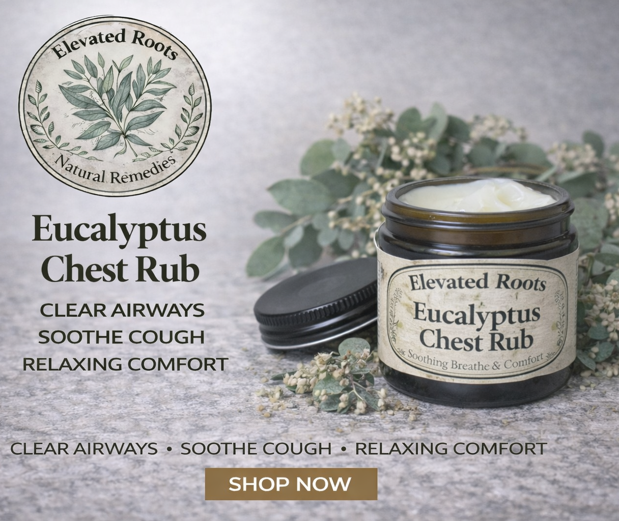 Our Eucalyptus Chest Rub is a soothing, aromatic herbal balm crafted to support clear breathing and seasonal comfort. Infused with eucalyptus and complementary botanicals in a nourishing oil base, this small-batch formula is designed to be gently massaged onto the chest, back, or soles of the feet during times of congestion or respiratory discomfort.